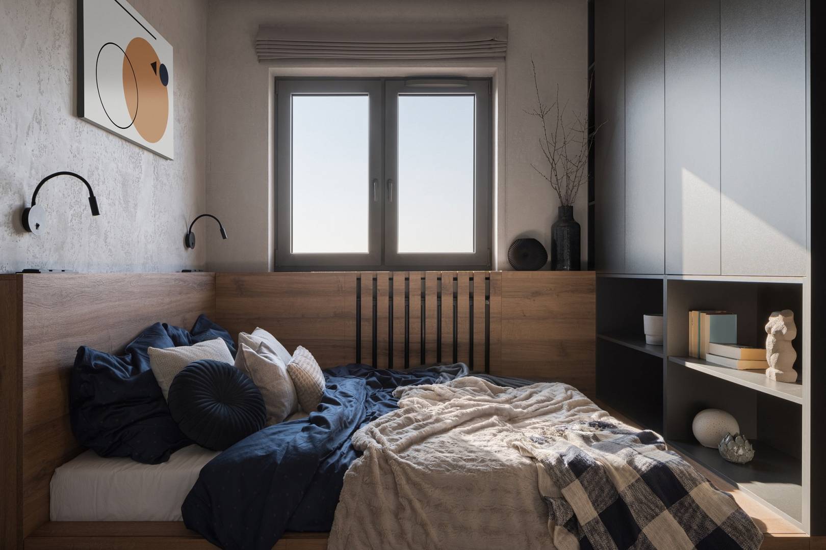 Zamiast masywnego łóżka z ozdobnym zagłówkiem postaw na minimalistyczną ramę o lekkiej formie. Wizualnie nie przytłoczy ona przestrzeni i zostawi miejsce na ścianie na montaż oświetlenia czy półki, na którą będzie można odłożyć aktualnie czytaną książkę.